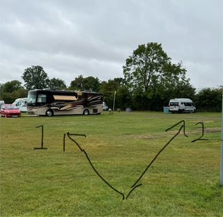 So back to the rain. The next day it was bouncing down. Having got soaked going to the showers I managed to drench everything in the van that I touched, a bit like that princess from Frozen, only with rain instead of ice. It was time to get van envy. Our neighbour’s van is huge gold thing the size of an articulated lorry, but with bay windows (not joking) and a rooftop helipad (well maybe not, but that’s what it looks like). (See photo 1= their van 2= our van). We stared at it, longingly, through our dripping windows, imagining the occupants sat around a 6-seater oak dining table, enjoying eggs Benedict and filter coffee off the family silver. Meanwhile we sat sipping lukewarm tea and airing our wet socks in the shower tray. Small is beautiful, I reminded myself and made another cuppa, cos I’m getting quite good at that now. In fact it’s my best campervanning skill so far. Apparently, the rain will stop at 1pm on the dot. My weather app is never wrong. So now I’m going to attempt to make some food while we sit it out and if we survive that, we will pop into Stratford to see some Shakespearey things. Happy camping!